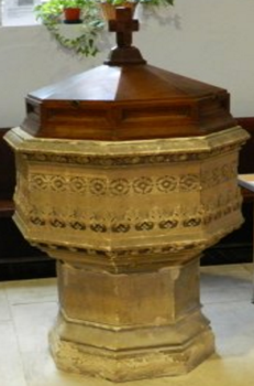 The word ‘font’ comes from the Latin word fons, meaning a spring of waterand reflects the fact that the font is the container for the water used in baptism. The font is usually positioned somewhere near to the main door of a church, as it is now at Otley Parish Church, to emphasise the idea that when you are baptised you are enteringinto the life of the church and becoming a member of the community of faith. In fact, our stone font (Illustration 1)has only rarely been used for baptisms since it was decided that baptisms would take place as part of a Sunday service and that the ceremony of baptism itself would take place at the front of the church so the congregation could take a full part