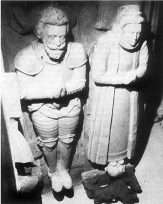 THE TOMB of the First Lord Fairfax of Cameron and his wife Ellen dominates the south transept. The tomb is made of limestone from Hazelwood Quarry near Tadcaster which was owned at the time by a branch of another local family, the Vavasours. The tomb has been badly damaged as a result of subsidence on its south side which has led to the shearing off of the feet of the effigy of Lord Fairfax. One of the notable features of this monument is the Saracen’s head at the foot of Lady Fairfax and this is interpreted as showing that an ancestor of Lady Fairfax had been on the Crusades.