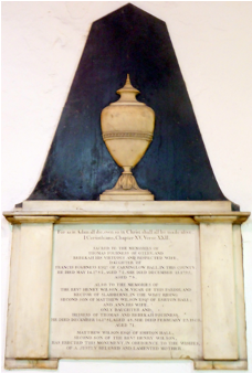 Now here’s the chance for you to see if you can spot an error. On the south wall of the nave there is a memorial to Thomas Fourness, his wife Rebekah Fourness, the Reverend Henry Wilson and his wife Ann. Henry Wilson was born in 1723, attended St John’s College Cambridge and was Vicar of Otley from 1761 until his death in 1781.